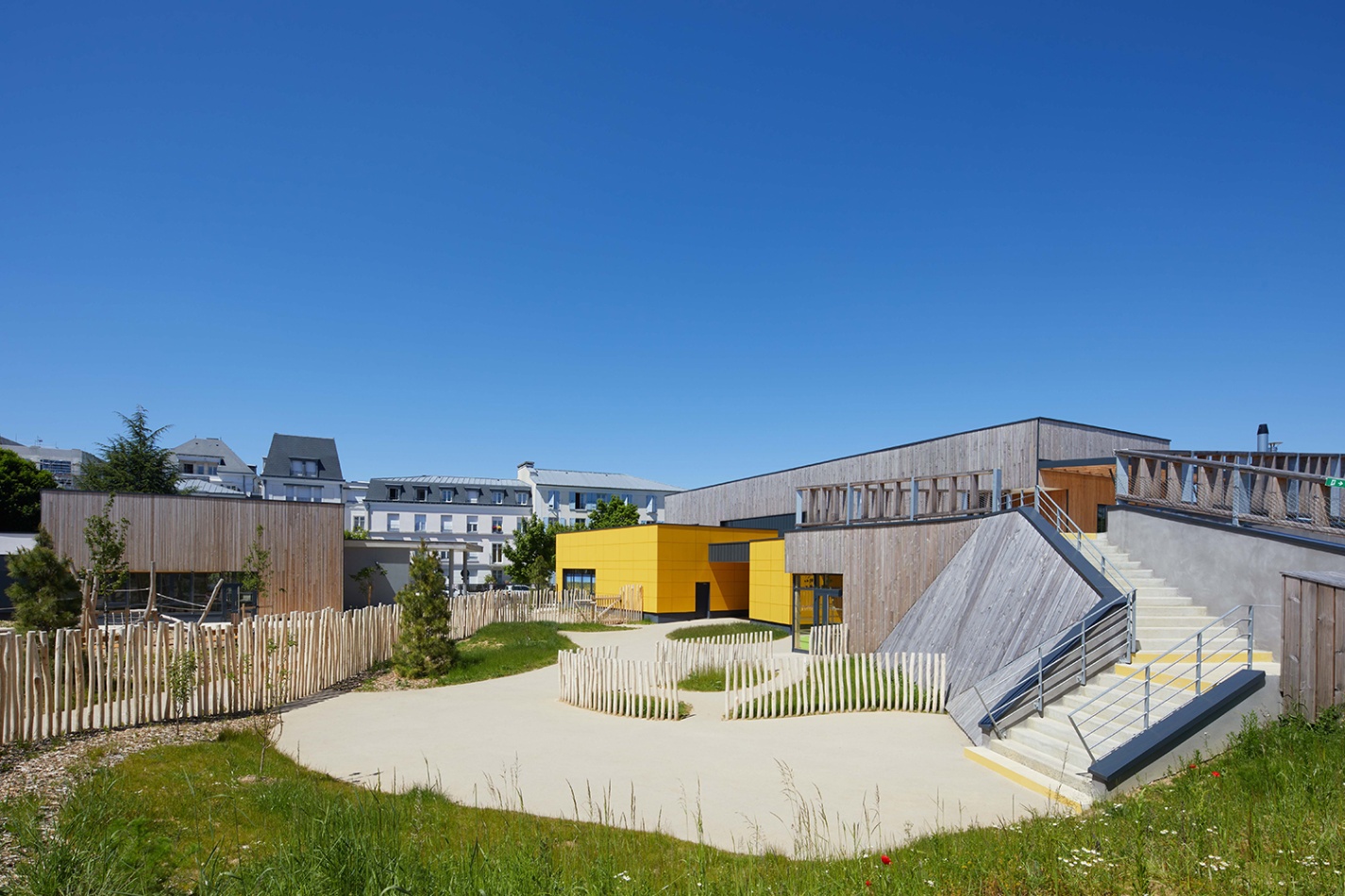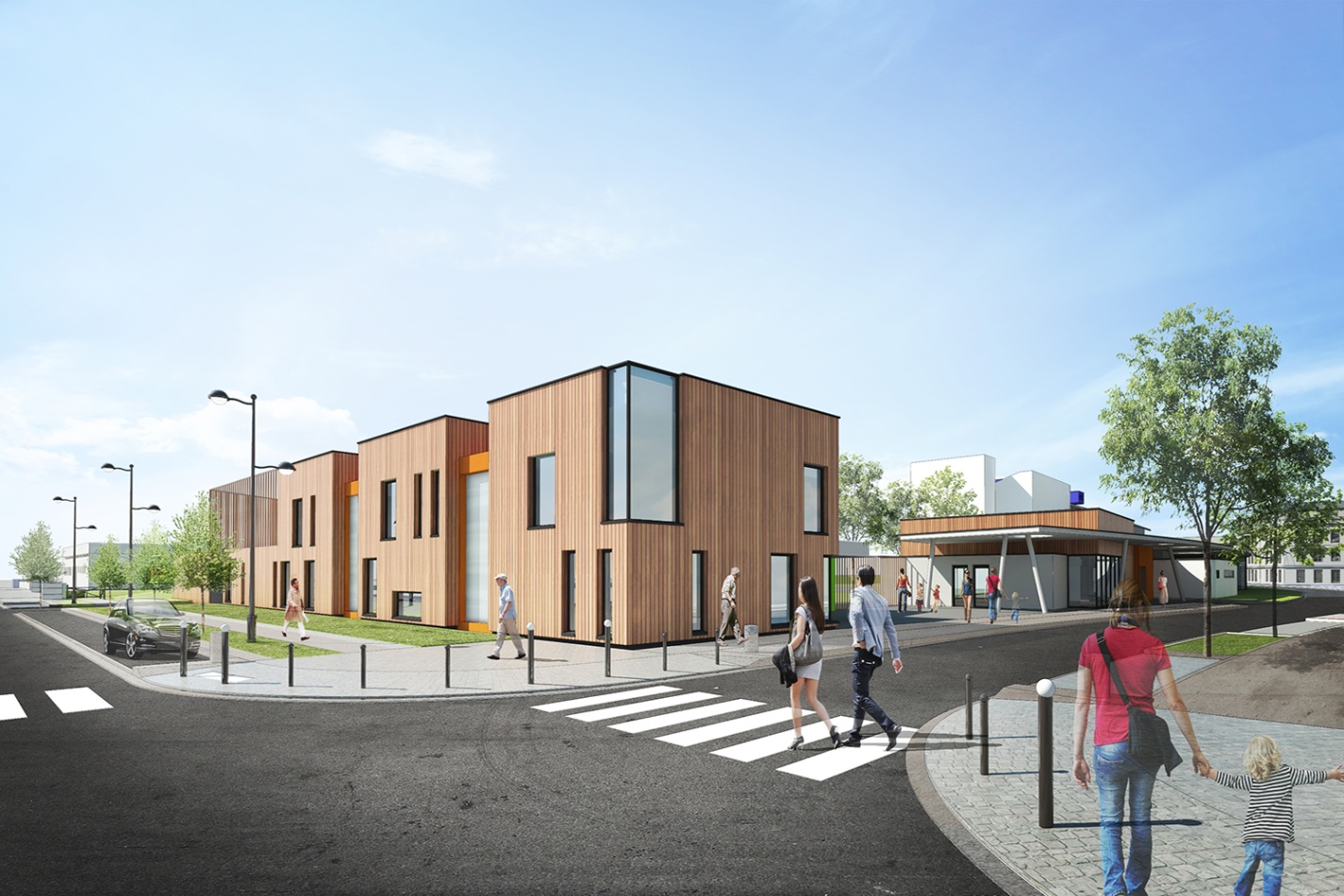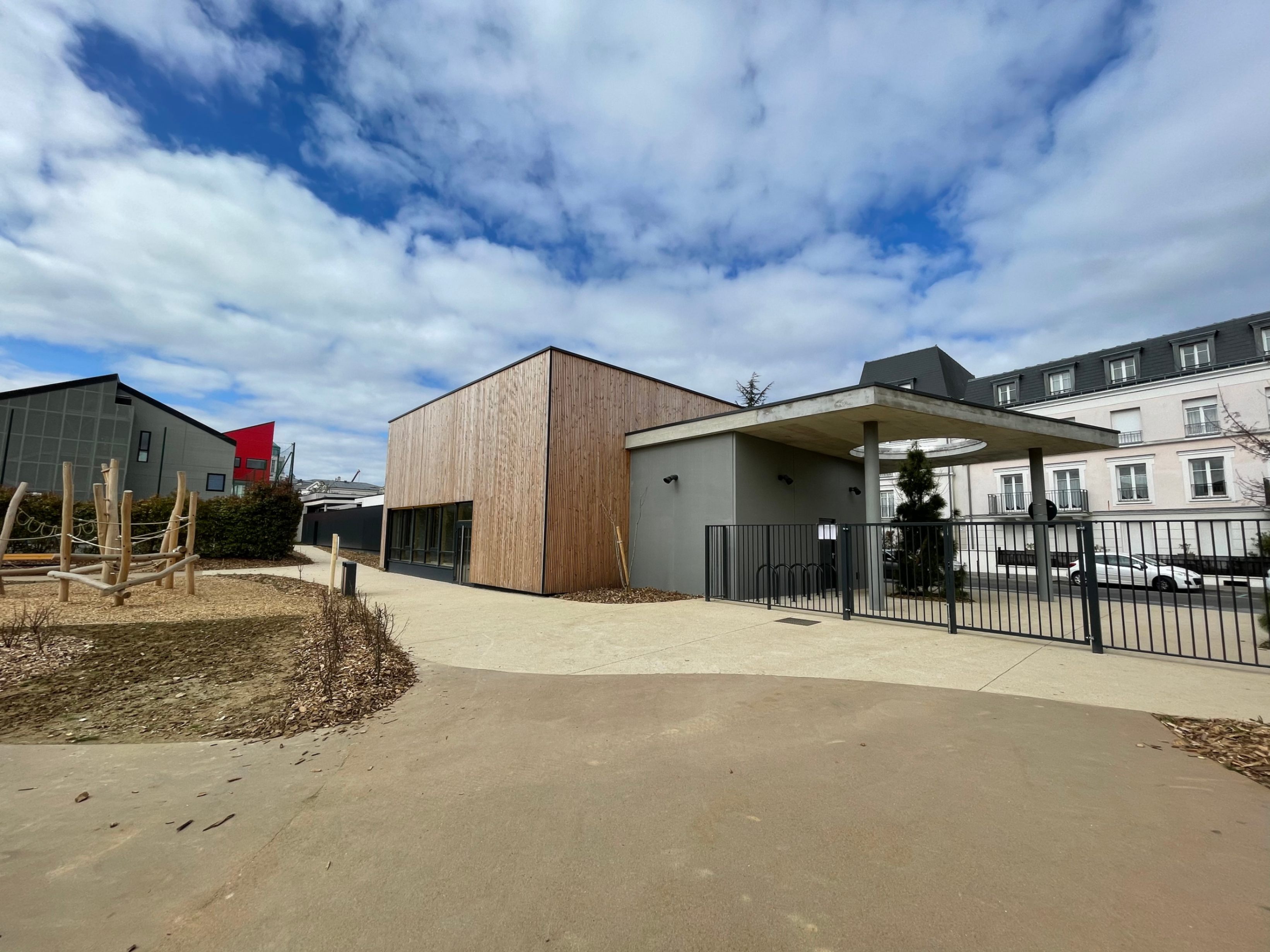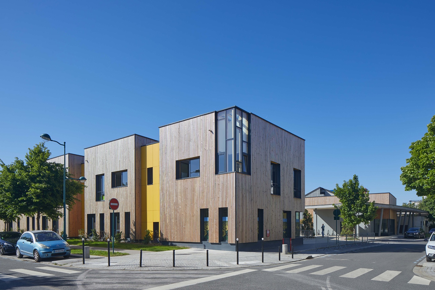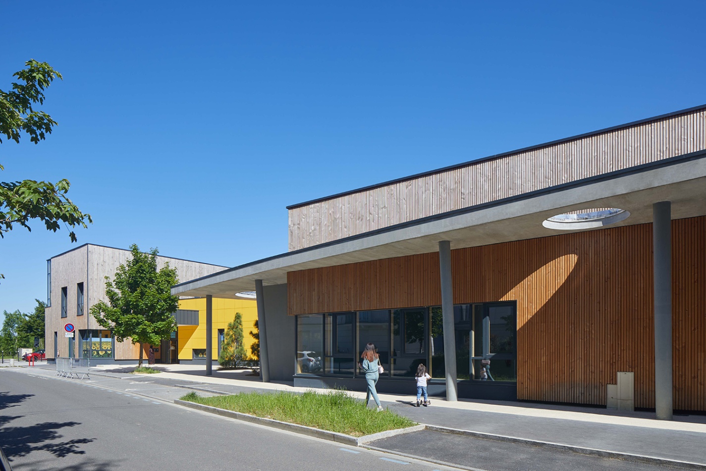 La Maison de quartier est traitée de manière à assurer une continuité visuelle avec la salle polyvalente existante et le groupe scolaire, tout en intégrant le transformateur existant en son sein afin de garder un traitement architectural cohérent. Pour cela, la grande courbe du auvent existant, est prolongée jusqu’au nouveau parvis créé et vient abriter l’ensemble des annexes de la nouvelle Maison de quartier. Seule la salle polyvalente, de grande hauteur vient émerger au dessus de ce auvent protecteur, véritable fil conducteur sur la rue du Bois de Paris. Partiellement perforée, quelques arbres viennent s’y loger. De la même manière que l’existant, on y retrouve des alignements de hauteurs et des rappels de couleurs. L’ensemble forme une unité fonctionnelle et architecturale. Ce nouvel équipement est construit de manière traditionnelle (maçonnerie) mais la salle polyvalente est bardée de bois pour annoncer un rappel avec l’Accueil de Loisirs.