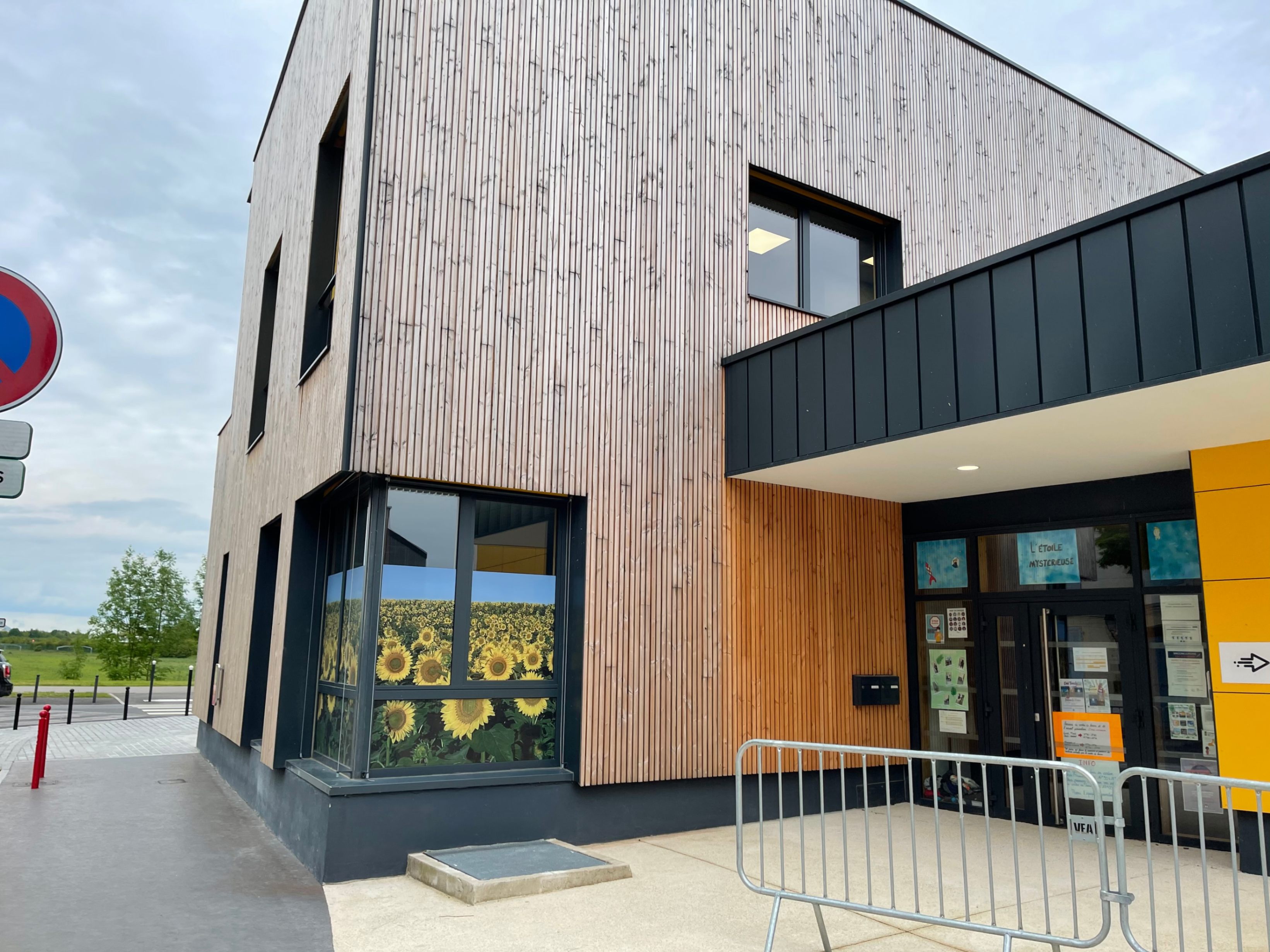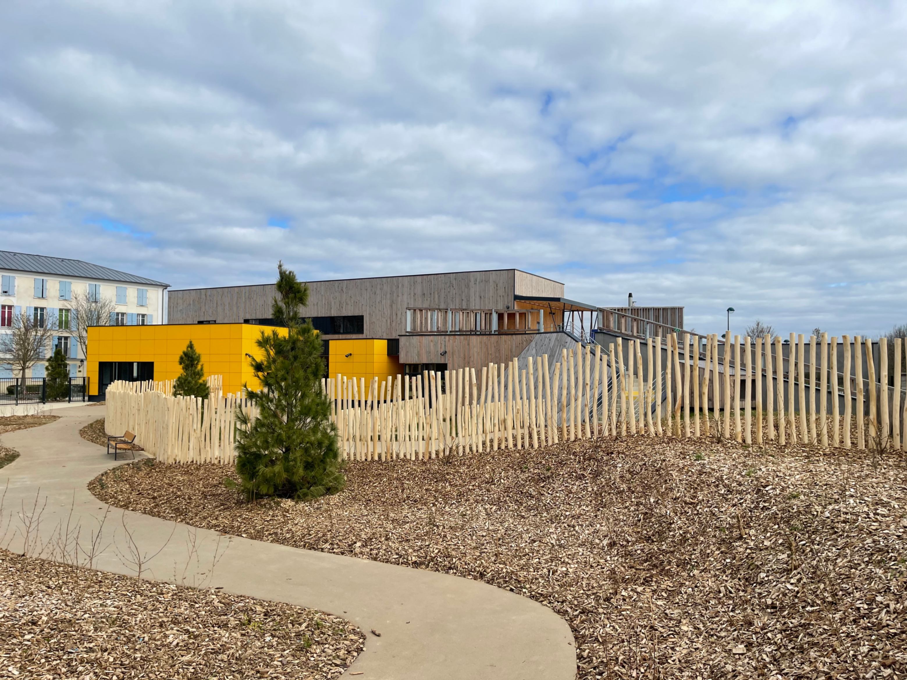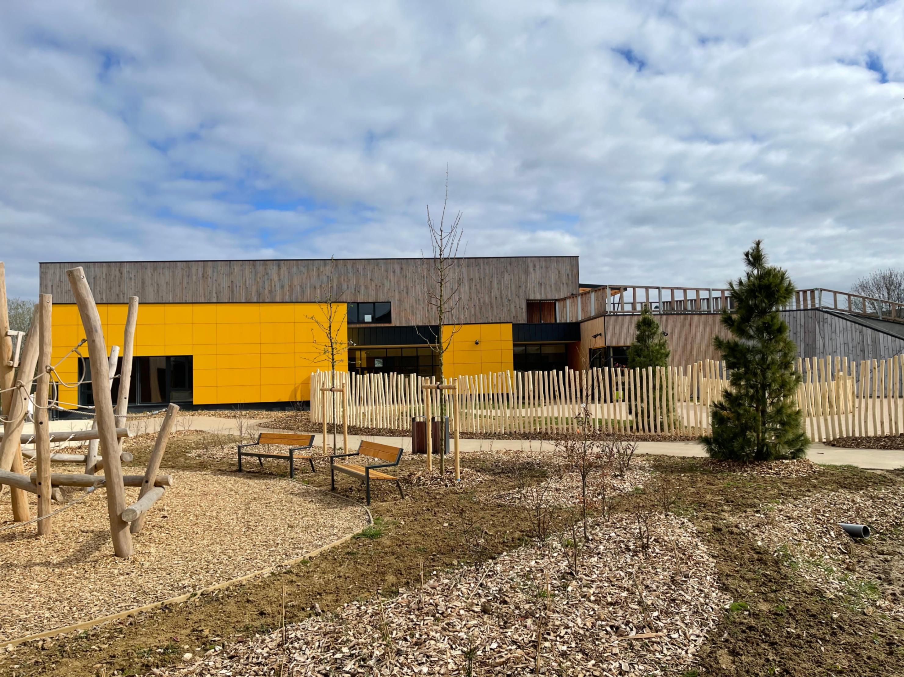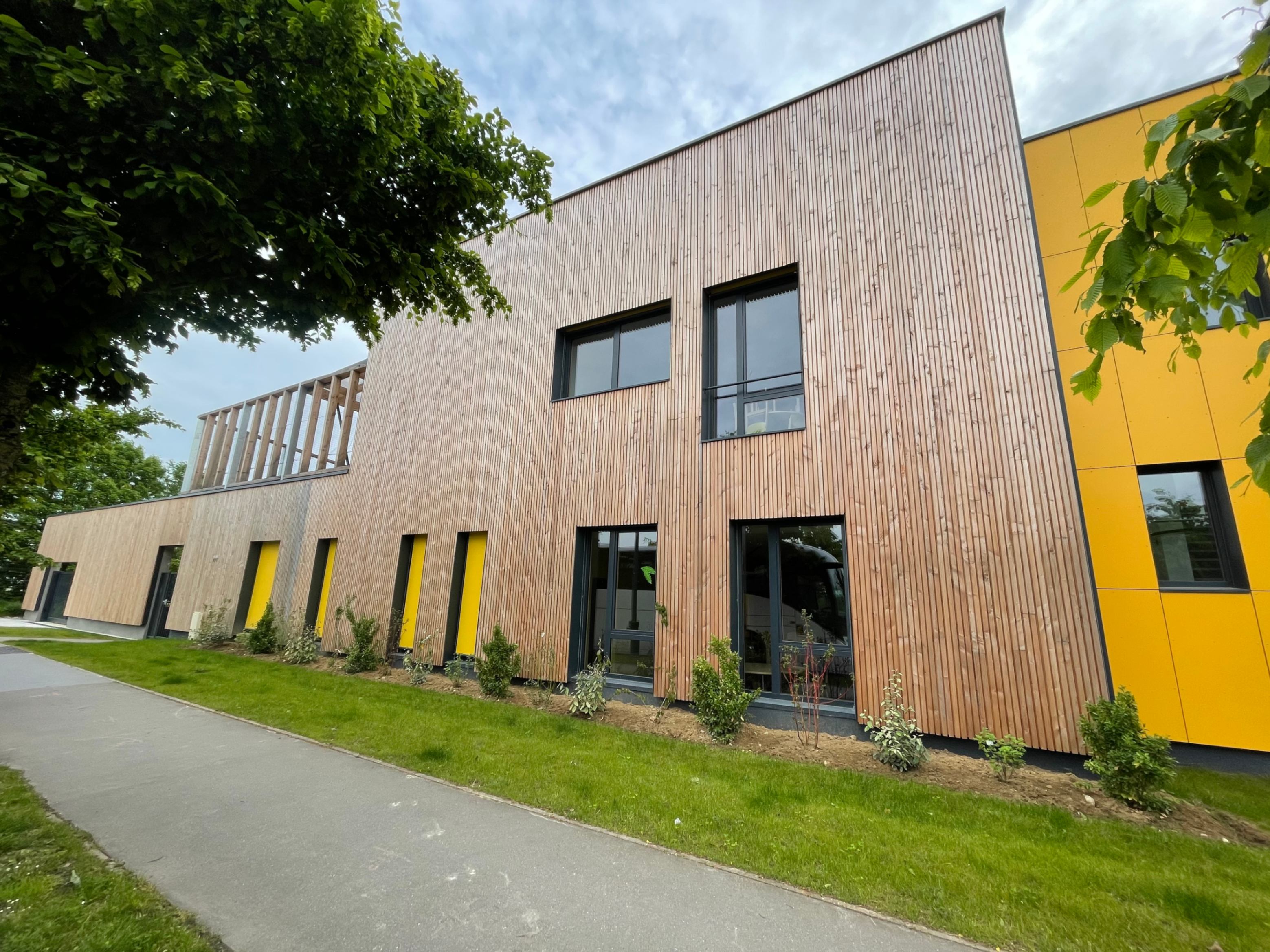 La Maison de quartier est traitée de manière à assurer une continuité visuelle avec la salle polyvalente existante et le groupe scolaire, tout en intégrant le transformateur existant en son sein afin de garder un traitement architectural cohérent. Pour cela, la grande courbe du auvent existant, est prolongée jusqu’au nouveau parvis créé et vient abriter l’ensemble des annexes de la nouvelle Maison de quartier. Seule la salle polyvalente, de grande hauteur vient émerger au dessus de ce auvent protecteur, véritable fil conducteur sur la rue du Bois de Paris. Partiellement perforée, quelques arbres viennent s’y loger. De la même manière que l’existant, on y retrouve des alignements de hauteurs et des rappels de couleurs. L’ensemble forme une unité fonctionnelle et architecturale. Ce nouvel équipement est construit de manière traditionnelle (maçonnerie) mais la salle polyvalente est bardée de bois pour annoncer un rappel avec l’Accueil de Loisirs.