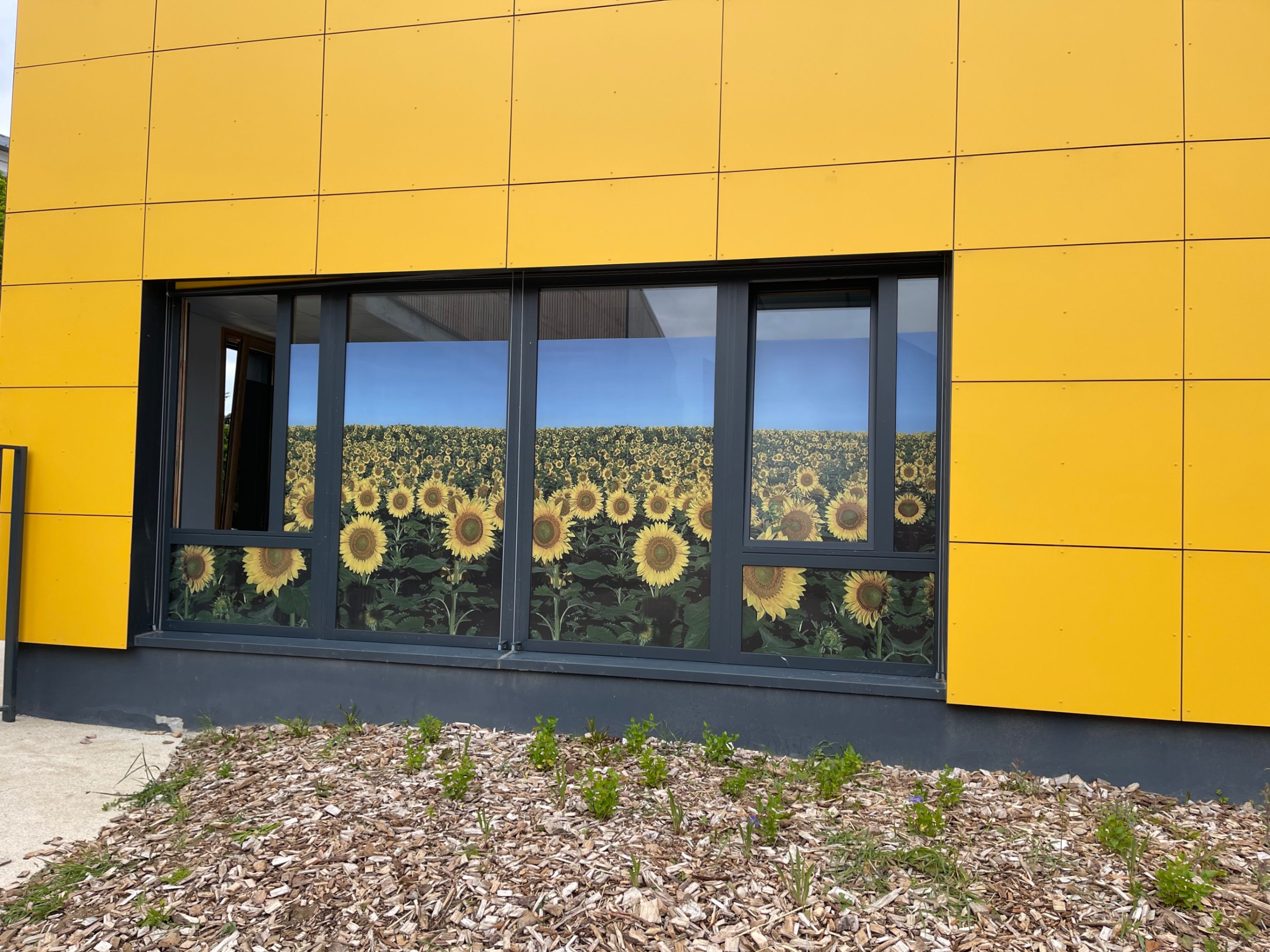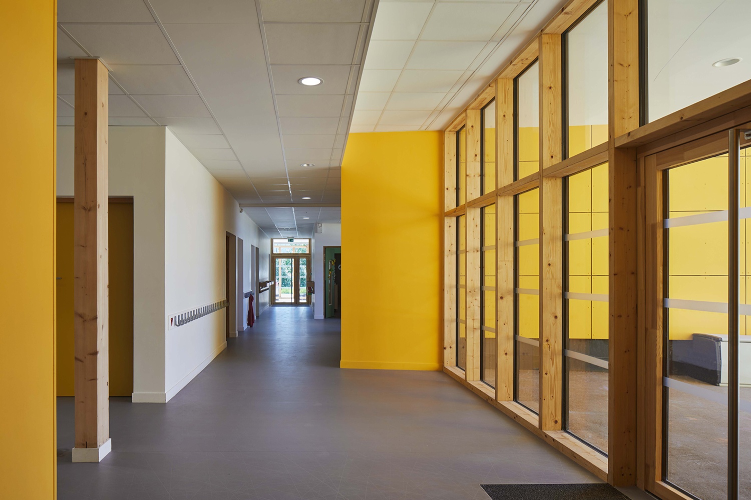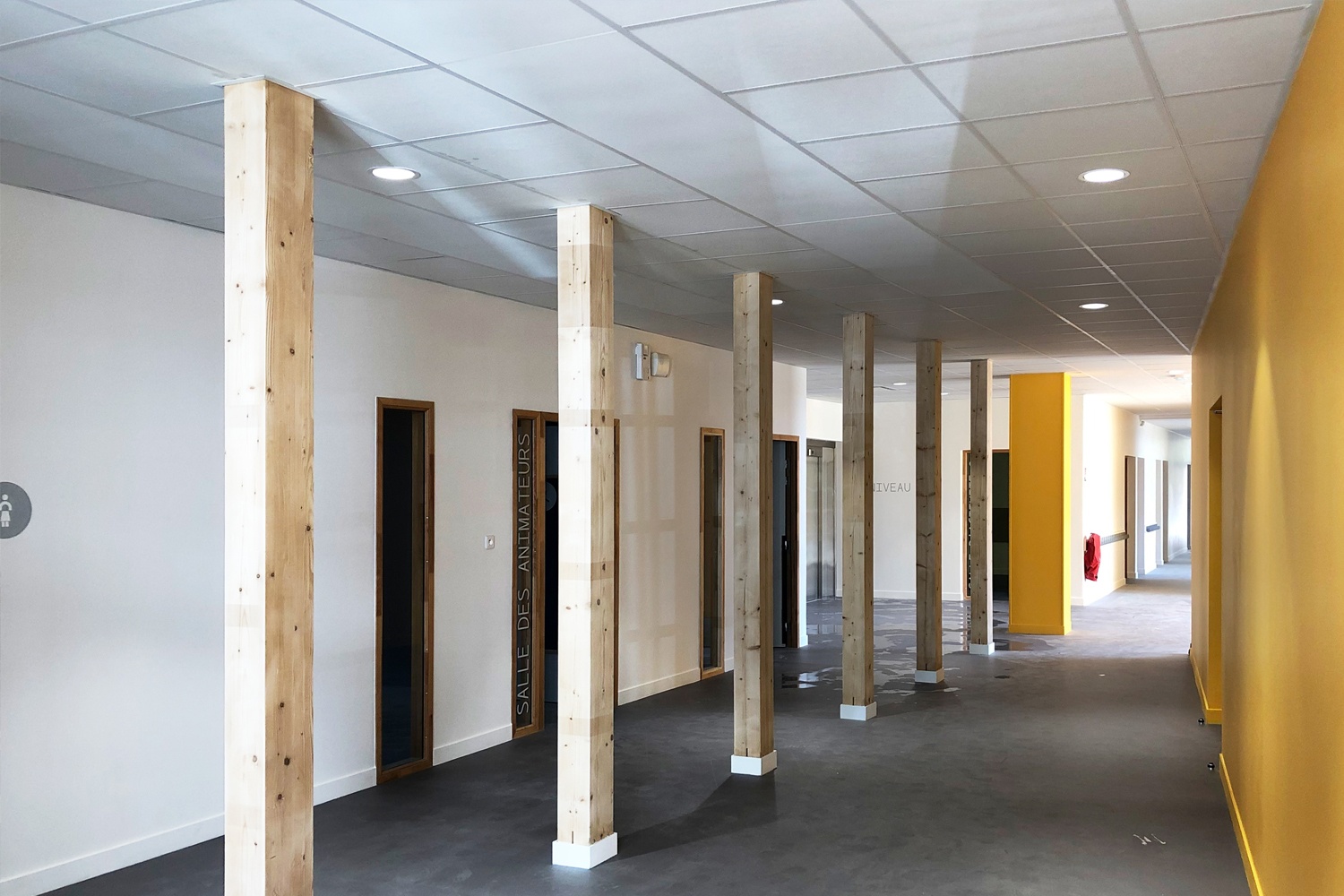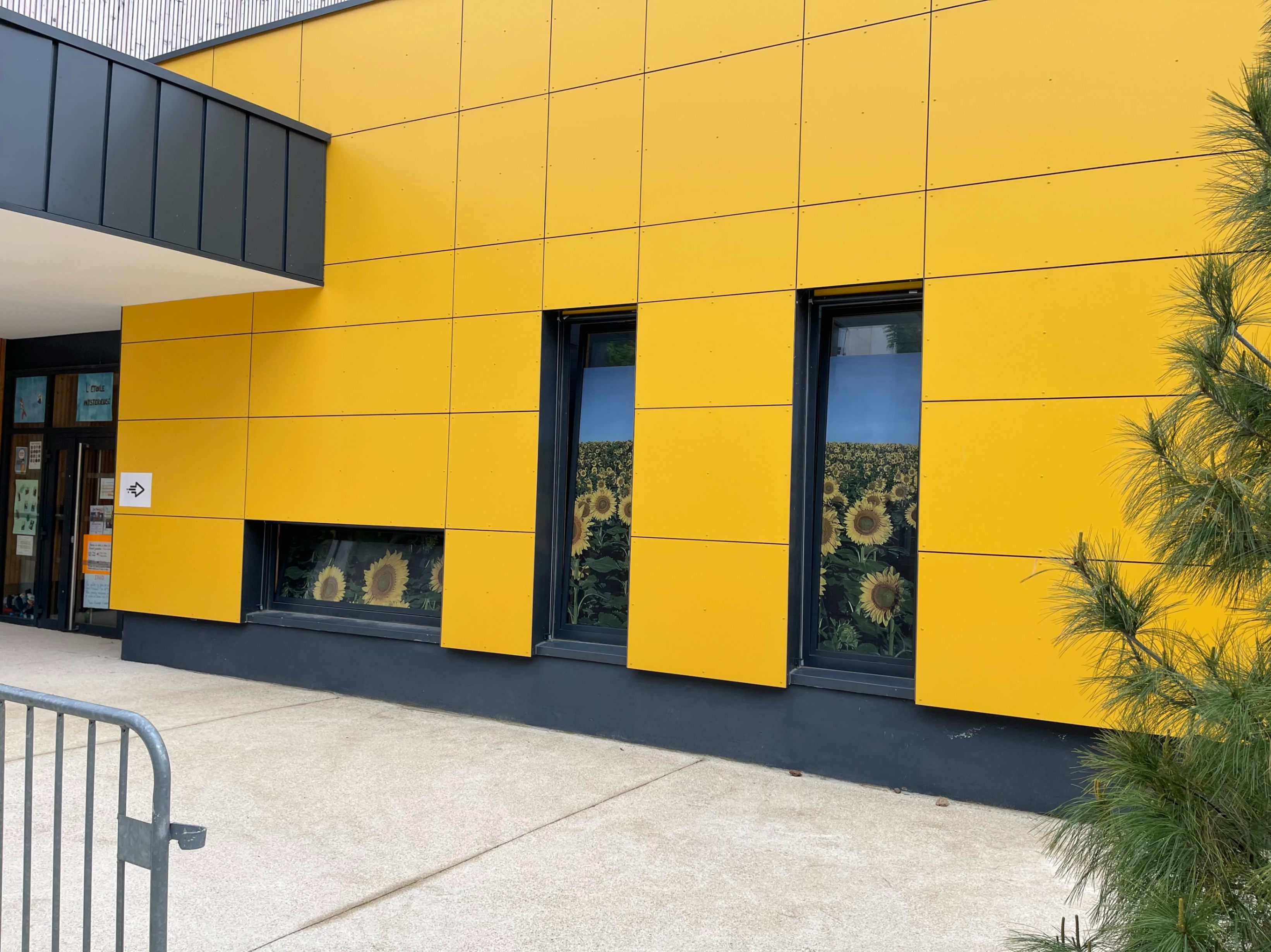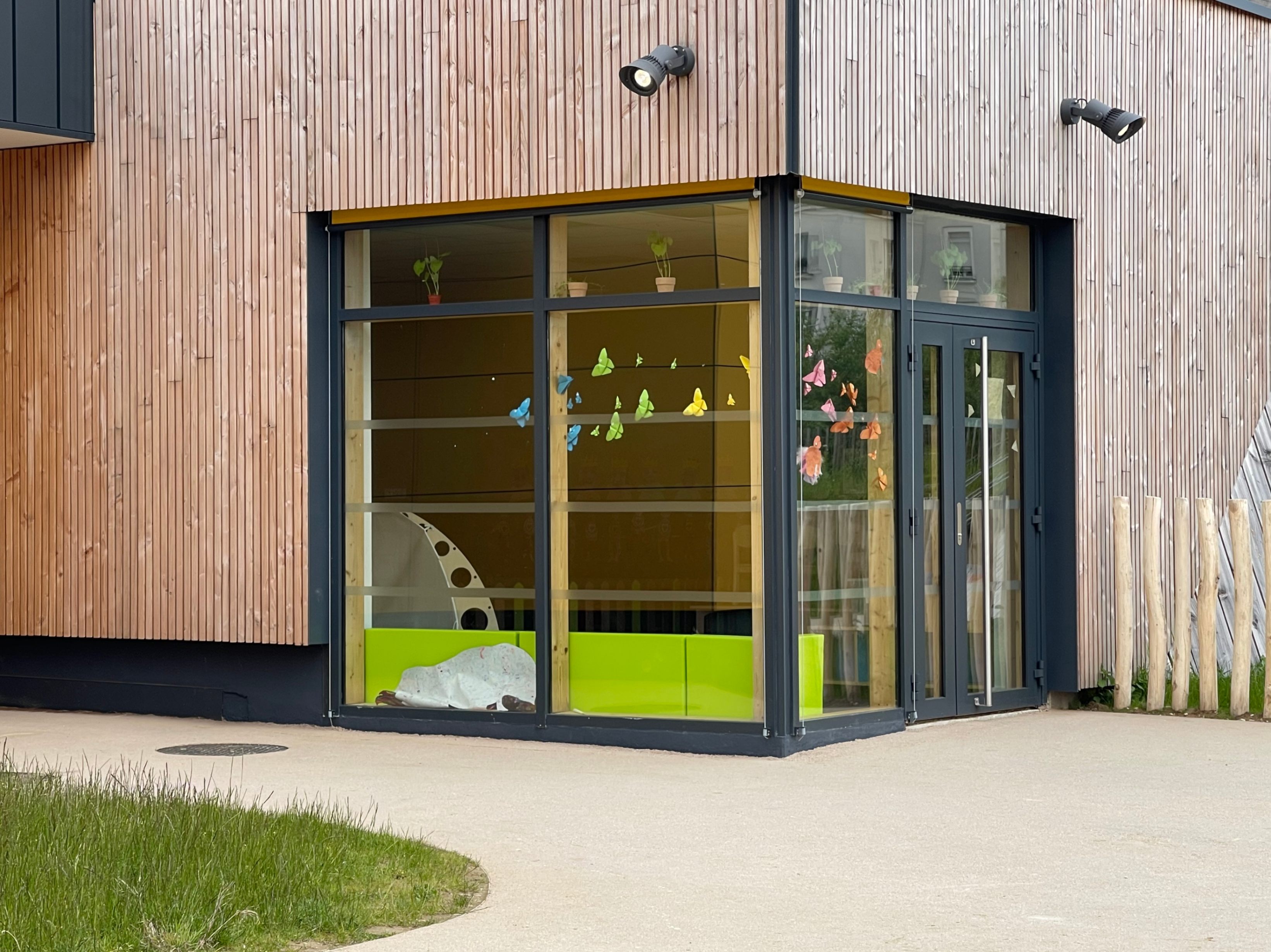 La Maison de quartier est traitée de manière à assurer une continuité visuelle avec la salle polyvalente existante et le groupe scolaire, tout en intégrant le transformateur existant en son sein afin de garder un traitement architectural cohérent. Pour cela, la grande courbe du auvent existant, est prolongée jusqu’au nouveau parvis créé et vient abriter l’ensemble des annexes de la nouvelle Maison de quartier. Seule la salle polyvalente, de grande hauteur vient émerger au dessus de ce auvent protecteur, véritable fil conducteur sur la rue du Bois de Paris. Partiellement perforée, quelques arbres viennent s’y loger. De la même manière que l’existant, on y retrouve des alignements de hauteurs et des rappels de couleurs. L’ensemble forme une unité fonctionnelle et architecturale. Ce nouvel équipement est construit de manière traditionnelle (maçonnerie) mais la salle polyvalente est bardée de bois pour annoncer un rappel avec l’Accueil de Loisirs.